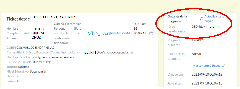 captura los datos que se te piden, y aparecerá una imagen como la siguiente, deberás anotar tu ID de seguimiento, espera a que te den respuesta al correo que proporcionaste: